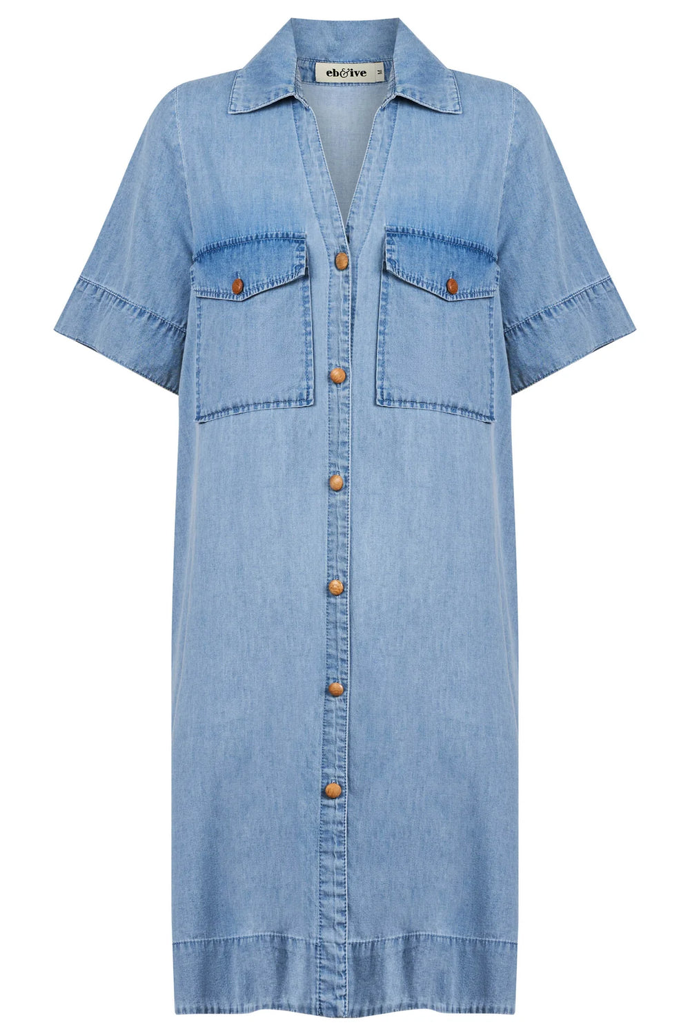 A beautifully soft and lightweight chambray shirt dress for everyday ease and elegance. Crafted from 100% cotton to create an effortless denim look. Features an open collar, wood button details, curved hem with stitched detail, small side splits, and functional front pockets.