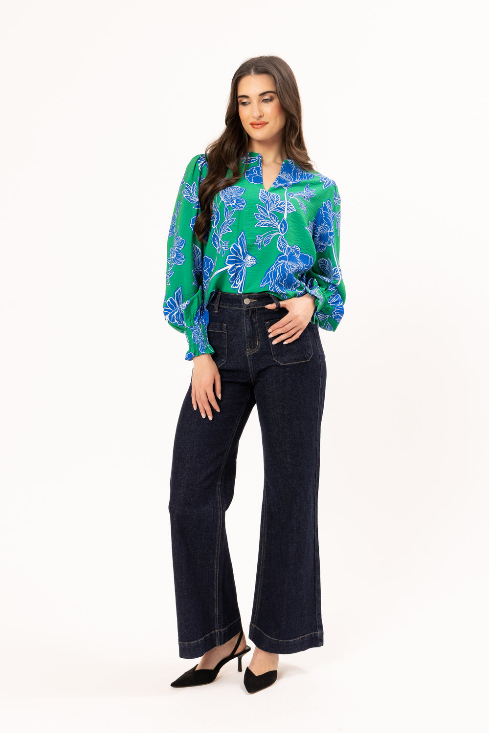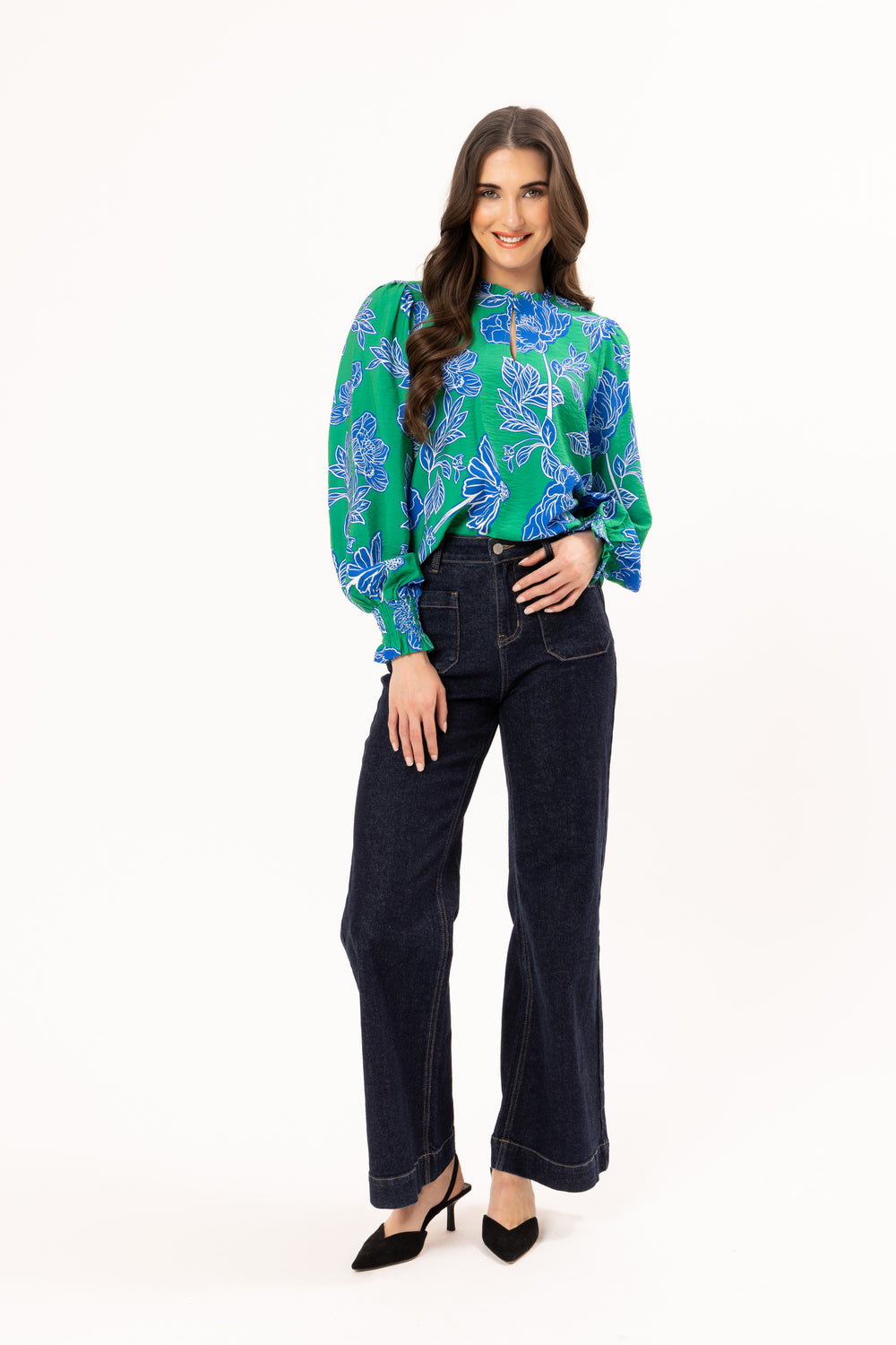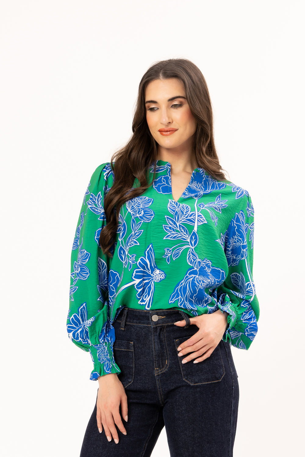 Elevate your wardrobe with this Movement blouse, perfect for any occasion. Featuring a flattering V-neck and a charming frill collar, this blouse adds a touch of elegance to your look. The hook & eye front neck closure ensures a secure fit, while the shirring cuffs and long sleeves provide a stylish silhouette. With a curved back hem, this blouse drapes beautifully, making it a versatile piece.