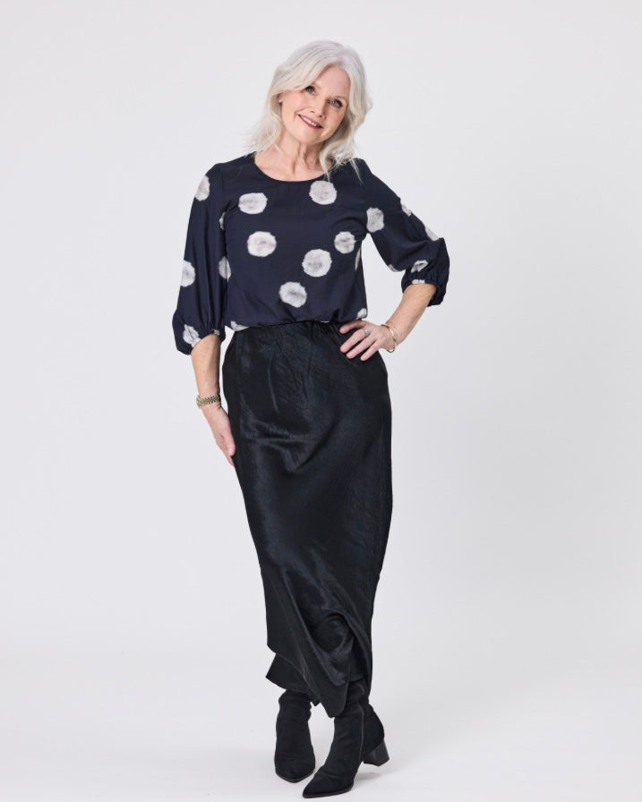 • A lightweight blouse with a round neck and three-quarter length balloon sleeves that gather at the cuff. • It features an all-over, bold spot/circle print on a dark navy or black background. • The top is made entirely from Polyester and is available in sizes 8-14