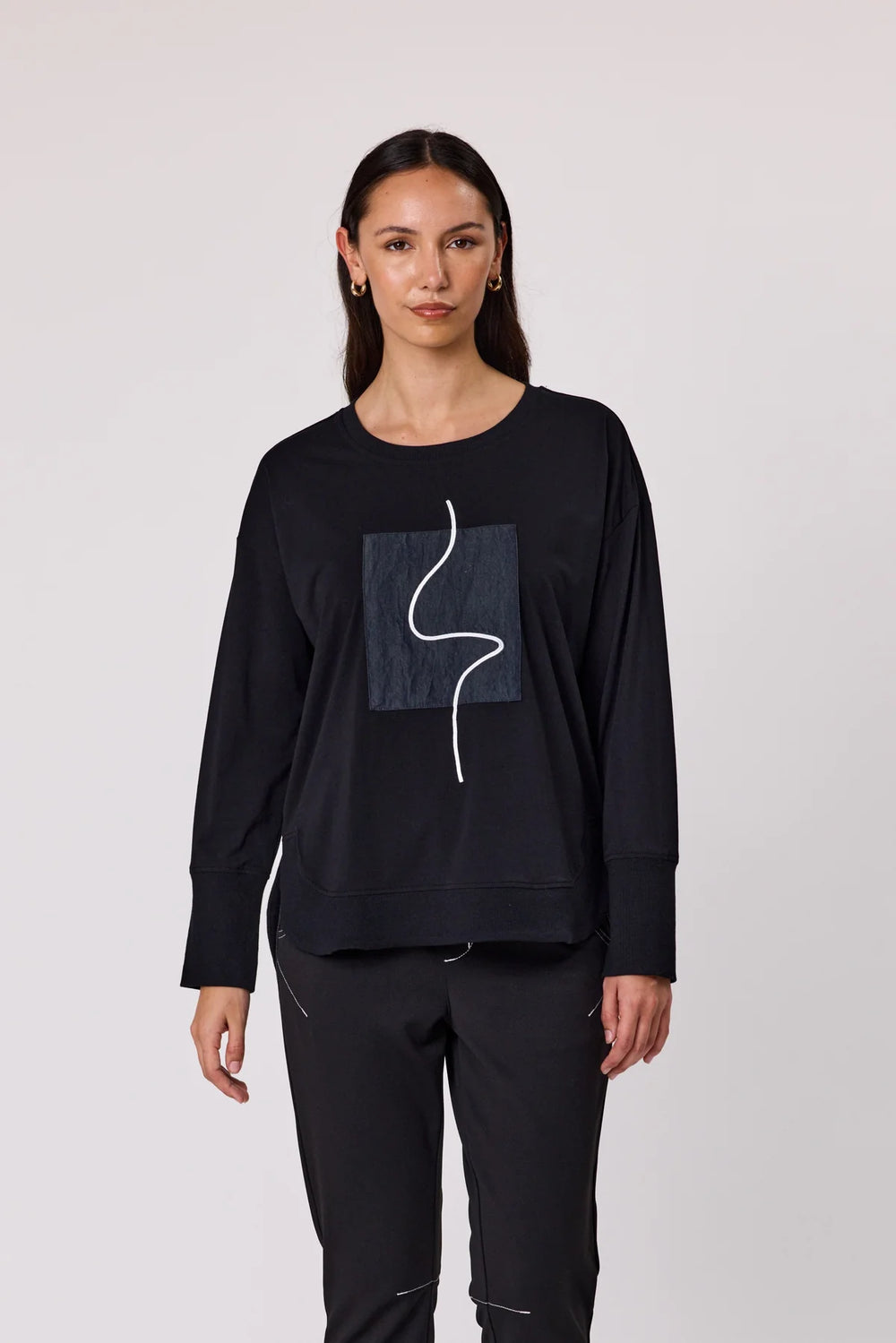 This Bella casual long-sleeve top brings a cool, laid-back vibe with its drop shoulder fit and front applique design. The ribbed neck and hem add a sporty touch, while the soft fabric keeps things comfy all day.