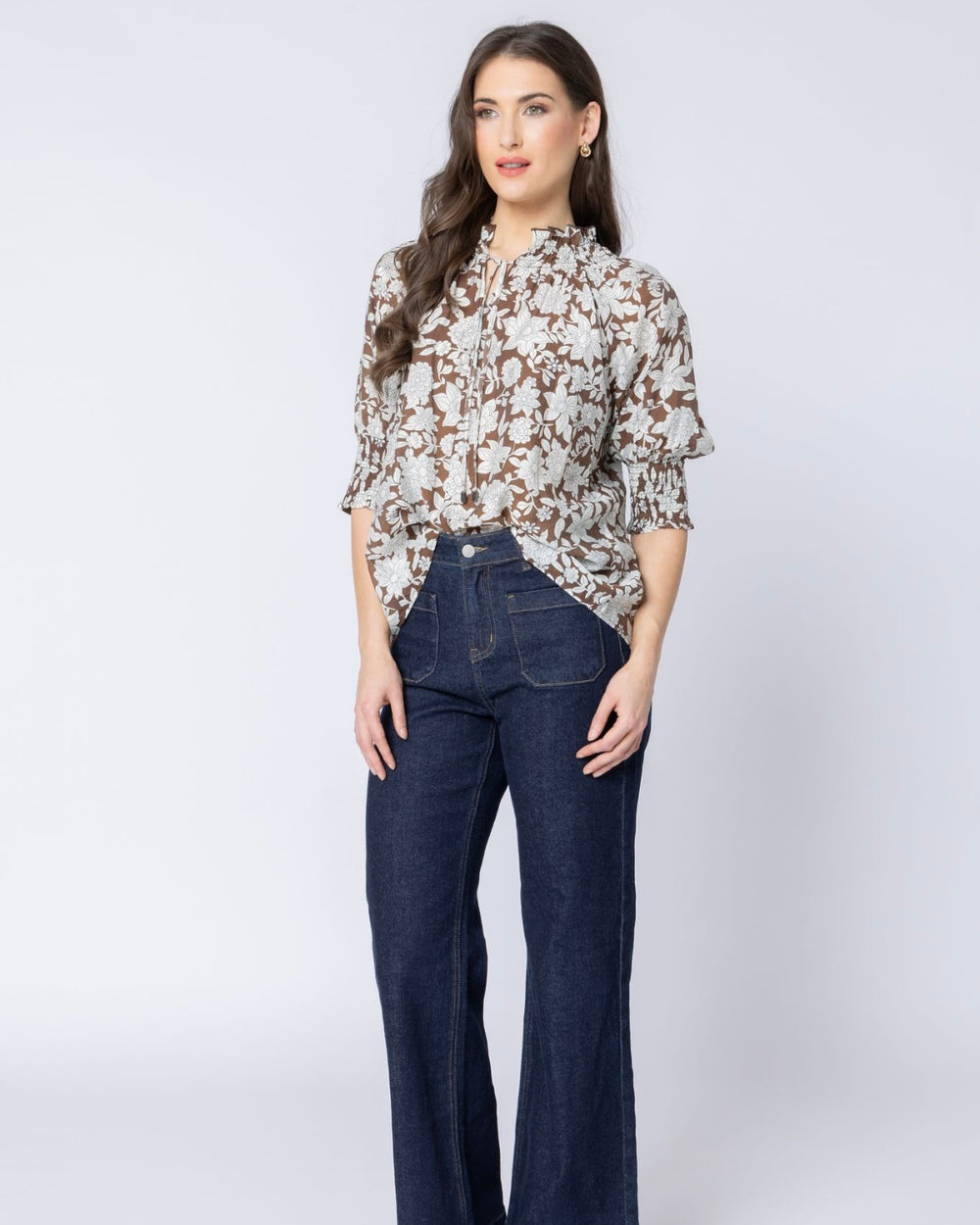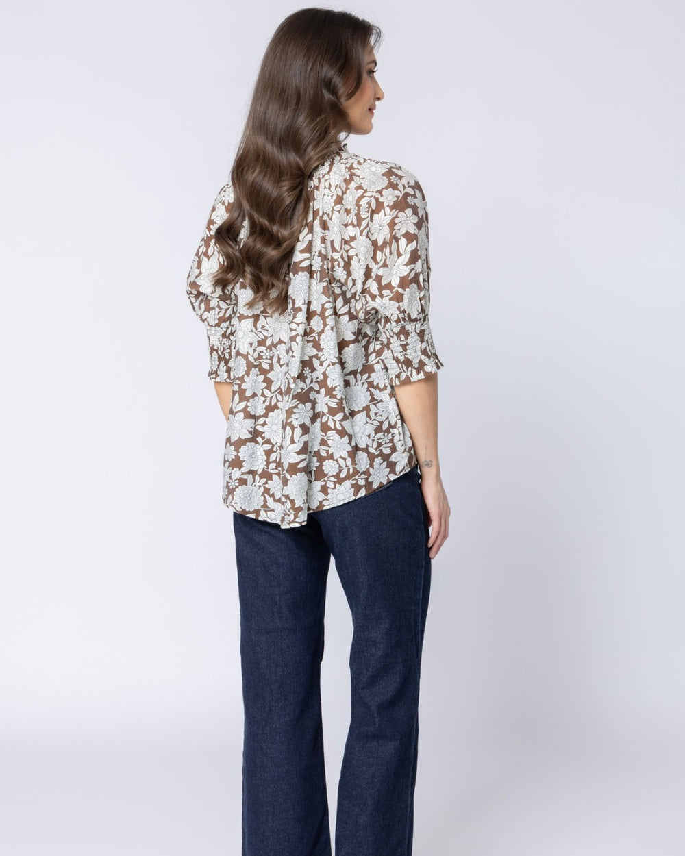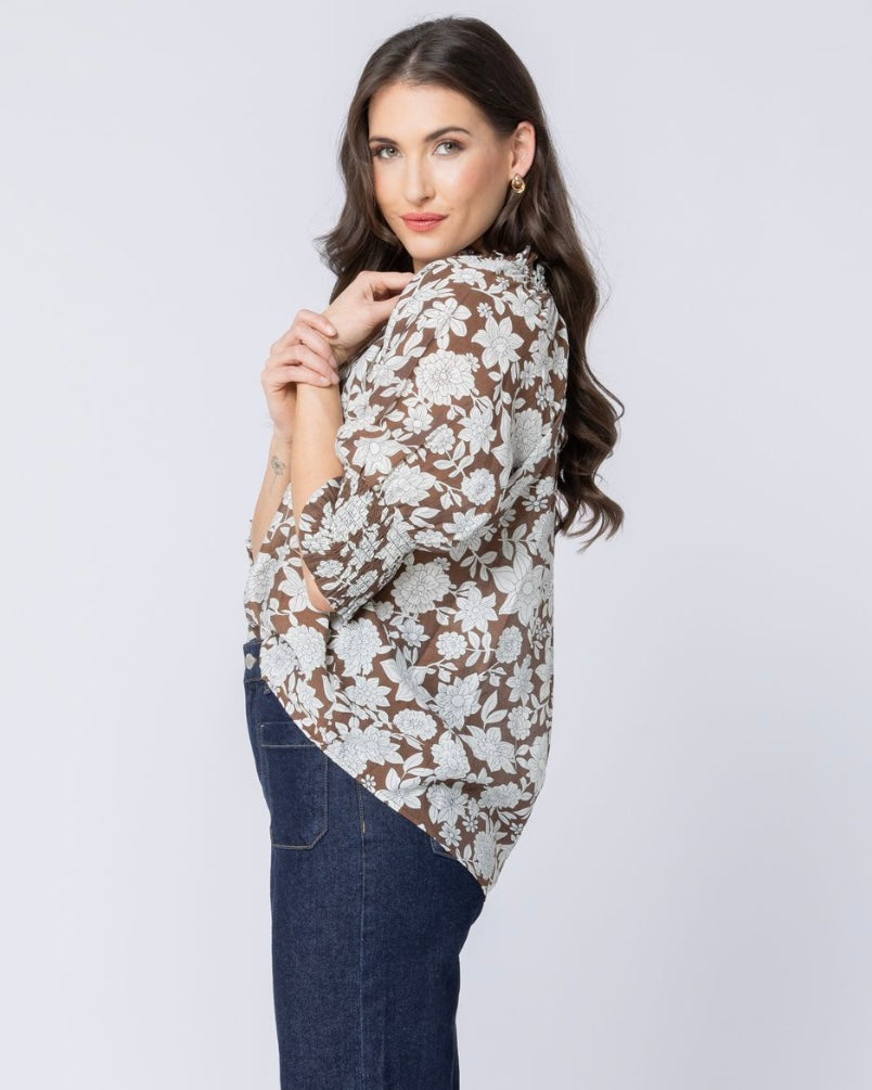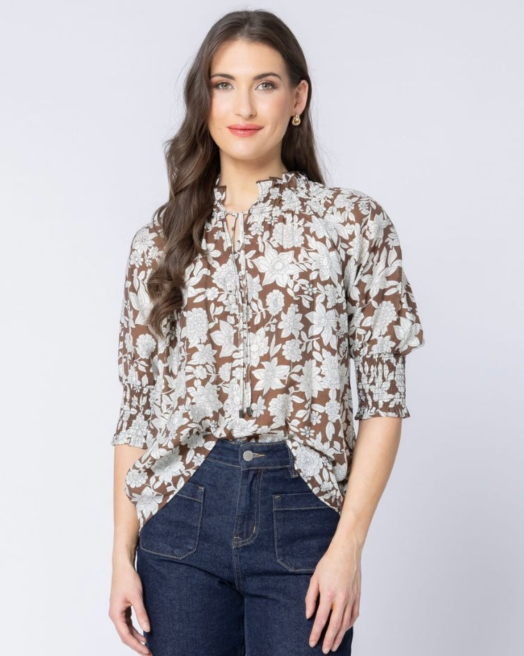 Ruching also features on the collar that can be secured with a same-fabric tie.