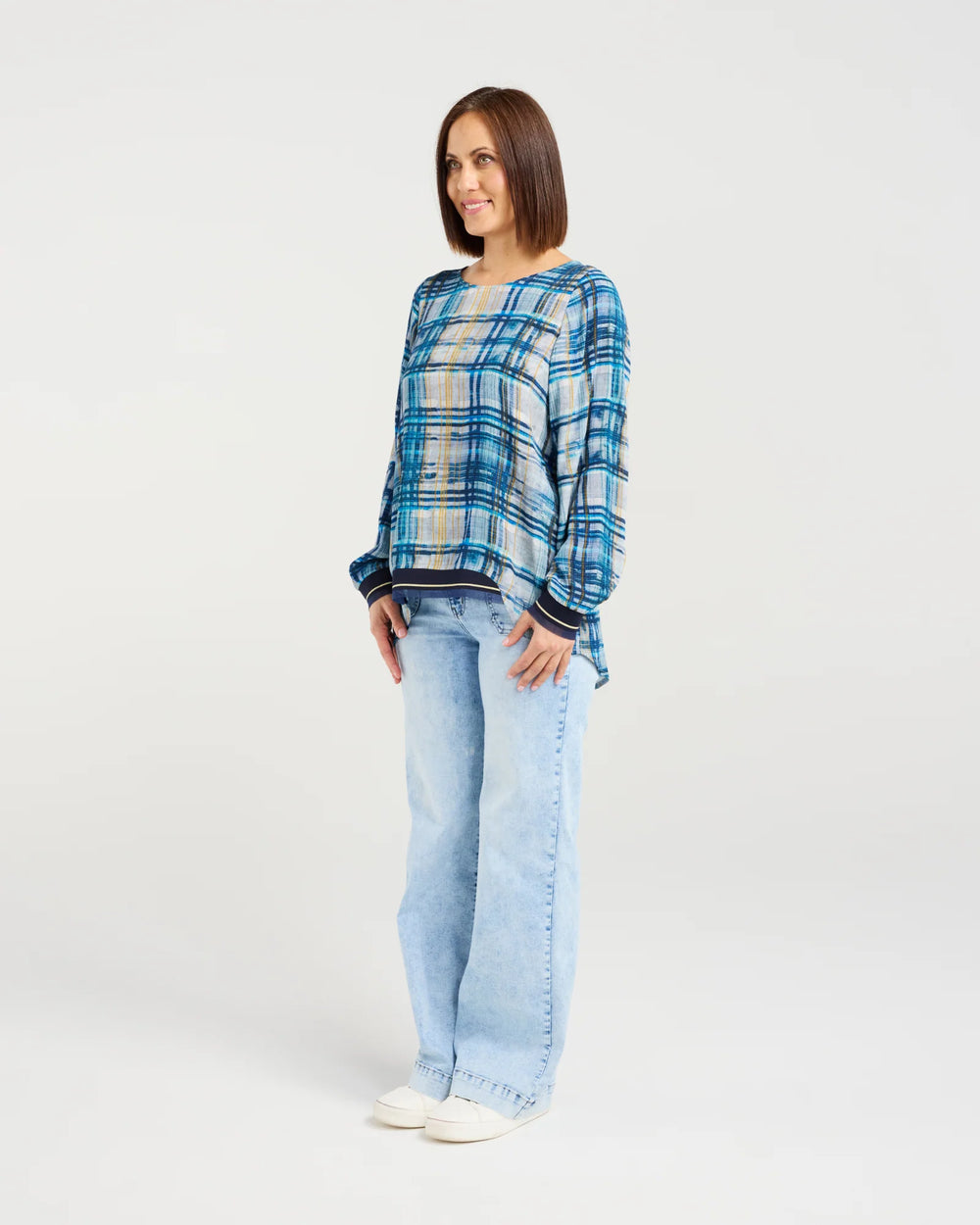 Our all-time classic long sleeve top gets a fresh update in a cool, modern ocean plaid. Designed with ribbed, elasticated cuffs and a front hem for comfort and shape, it is finished with a round neckline for an easy, timeless look.