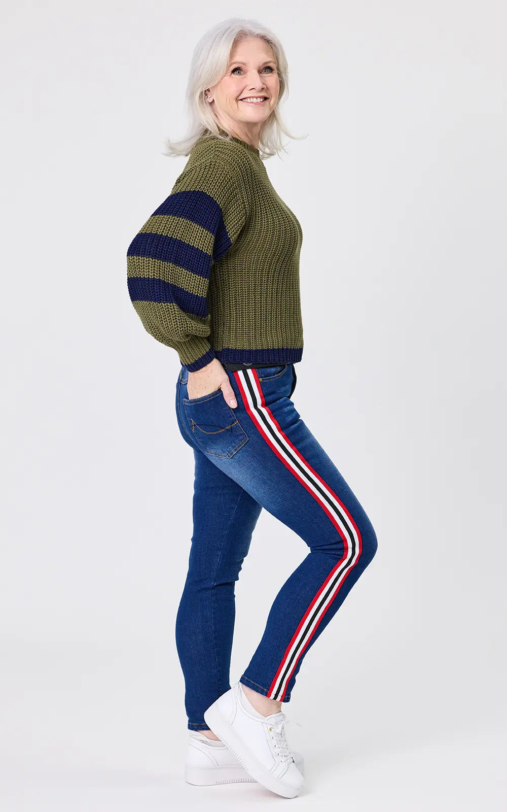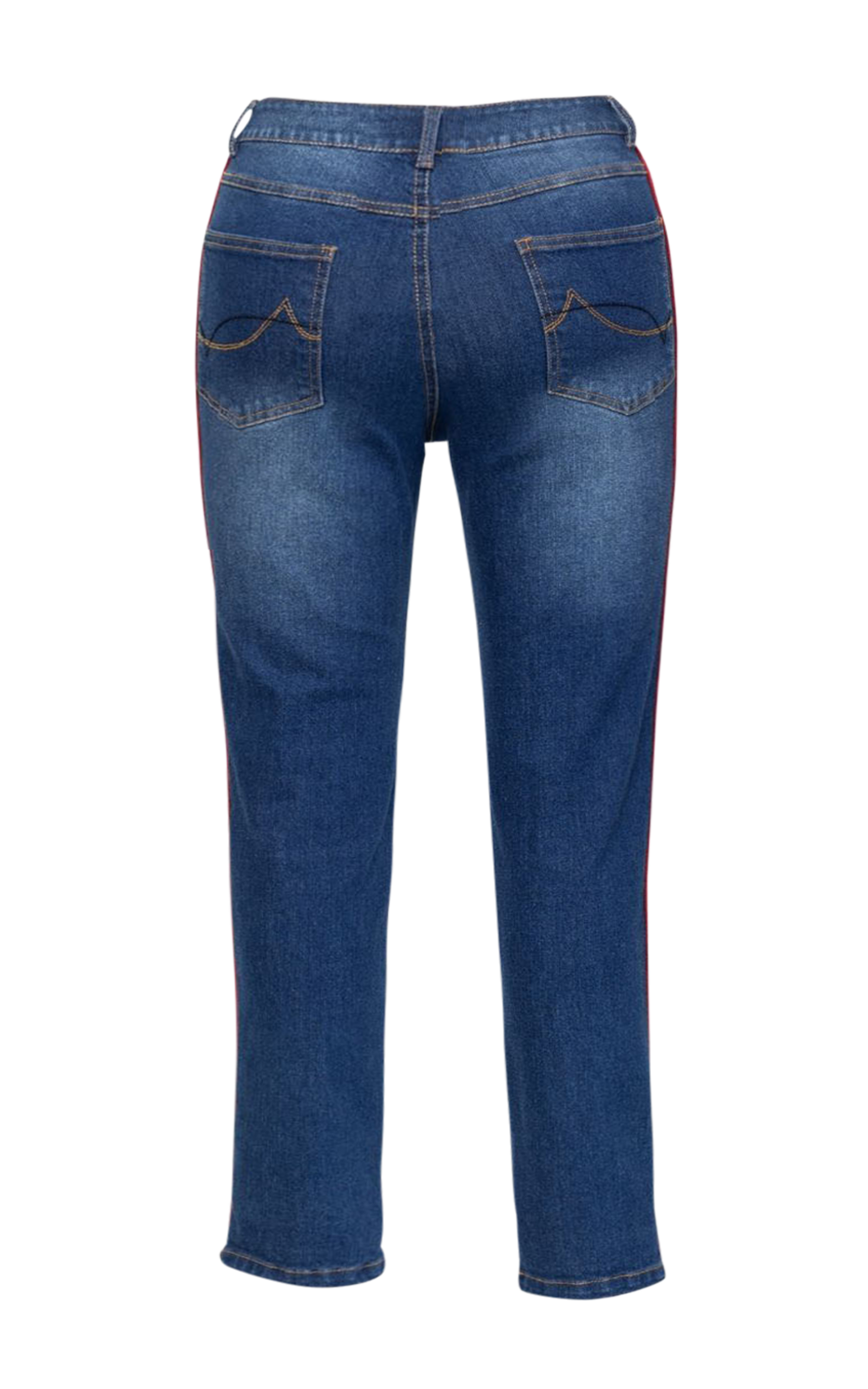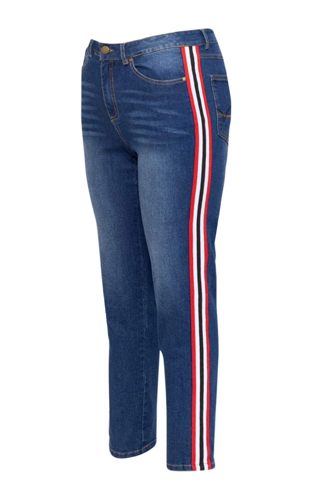 • Slim fit denim pants with a prominent sporty aesthetic.