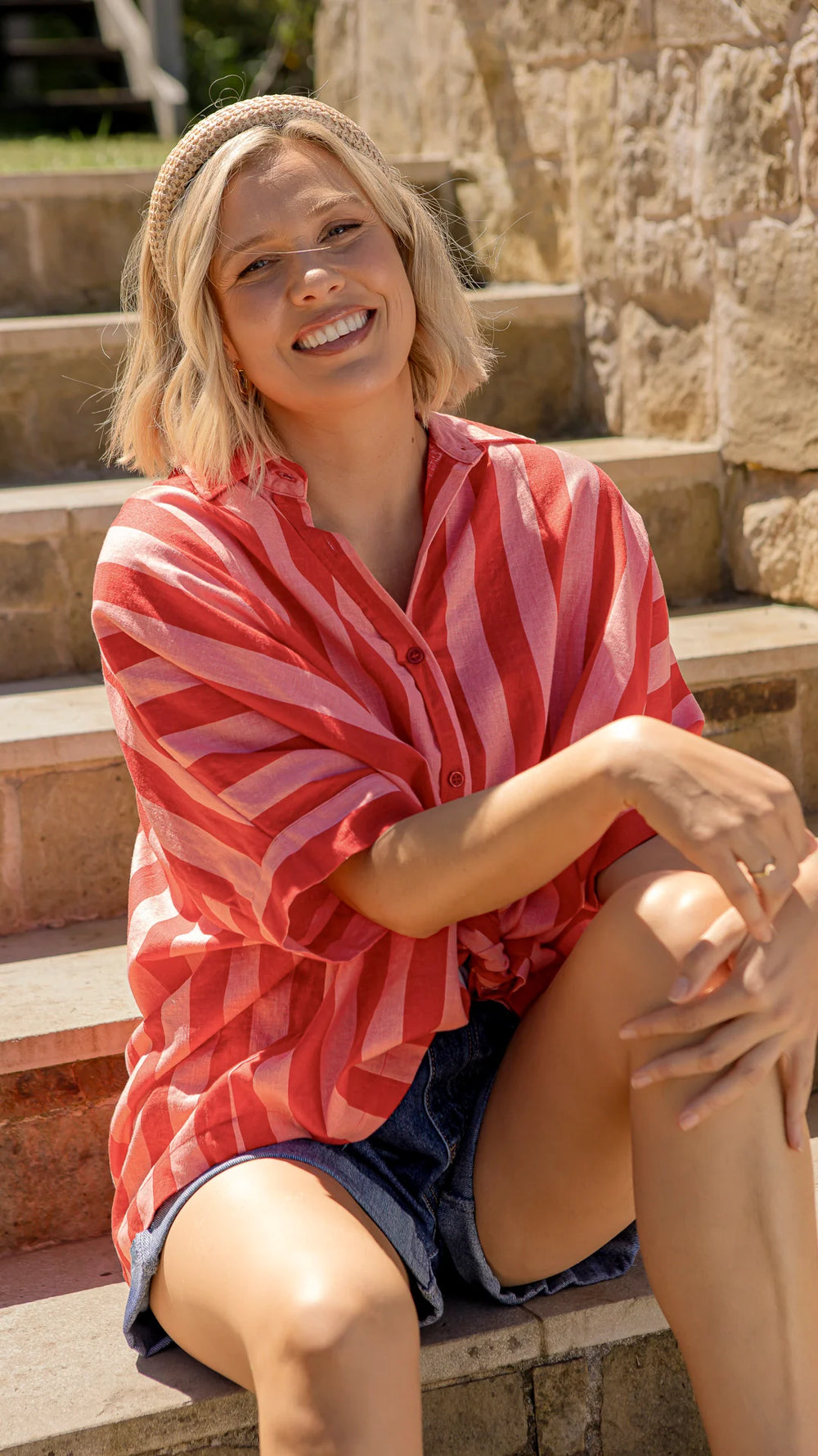 Elm Palermo Poppy Stripe Shirt. Our new favourite shirt! featuring a classic button through front this is the ideal shirt to wear open atop your shorts or swimwear, or button up and tuck in for a stylish put together look.