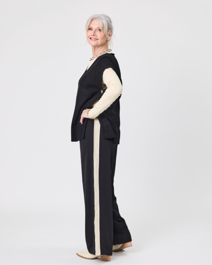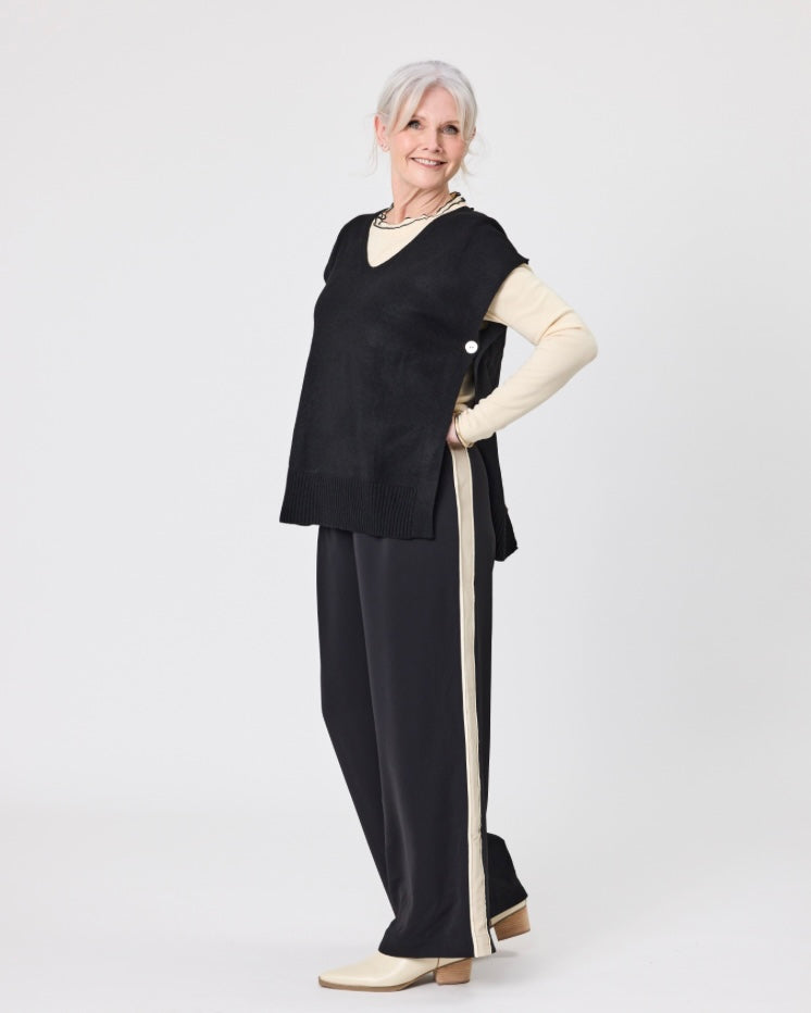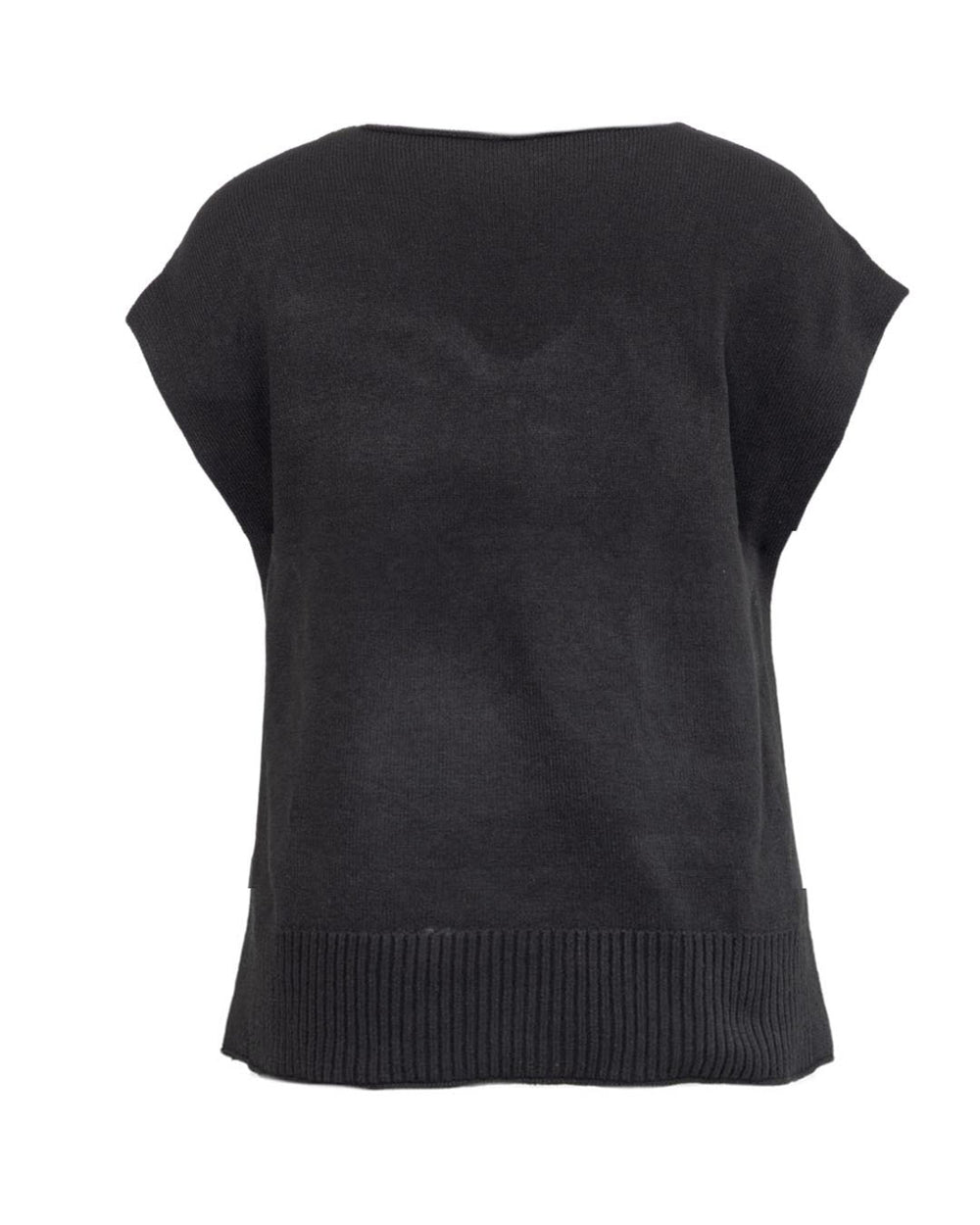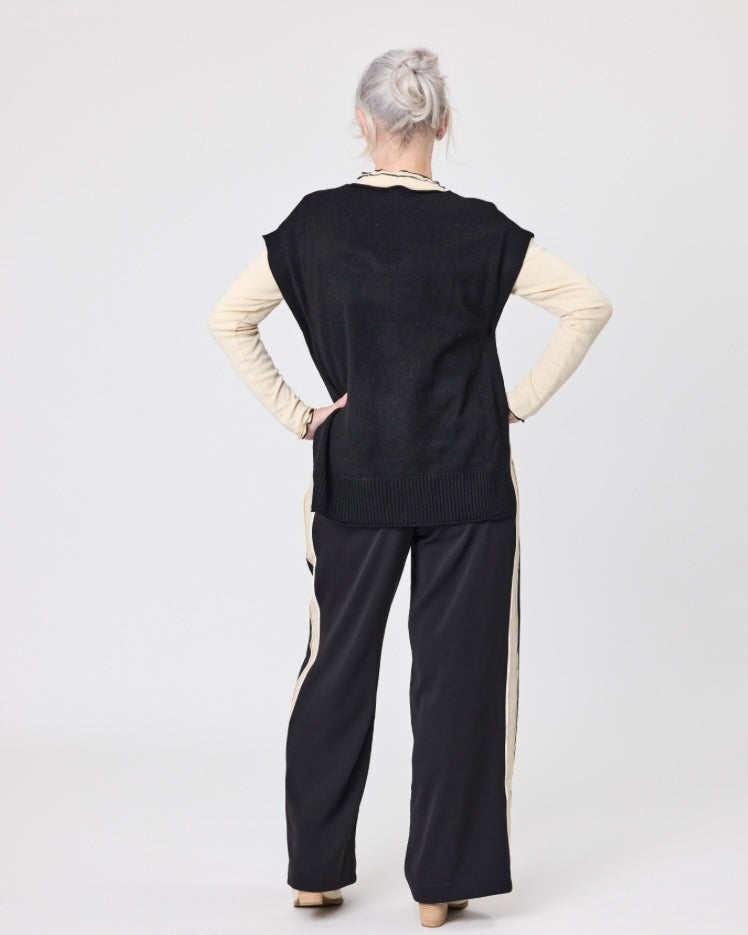 An oversized, pull-over knitted vest with a V-neckline and deep side splits,