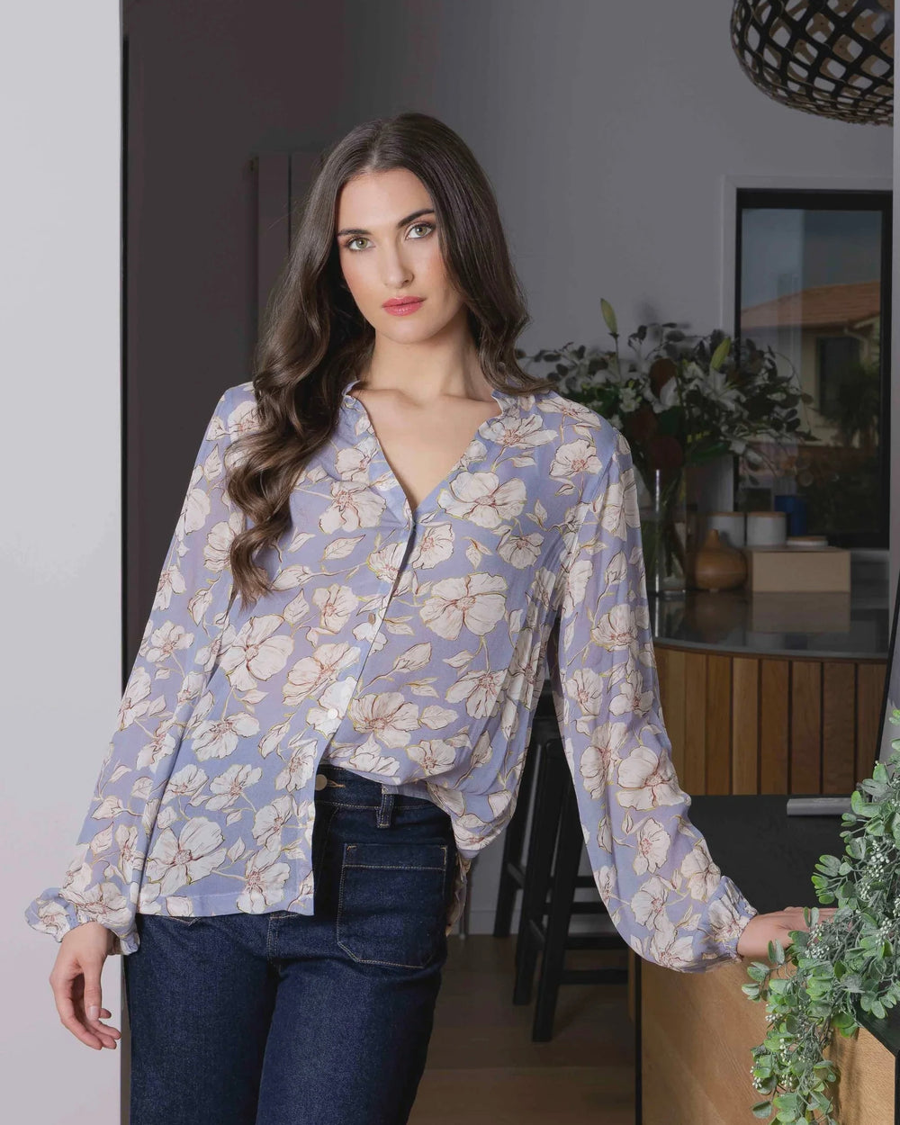The Seeking Lola Full of Life Top in the Sky Garden print is a sheer, feminine piece in a soft lilac hue. Finished with a button front, it’s perfect for adding a light, pretty layer to your look.