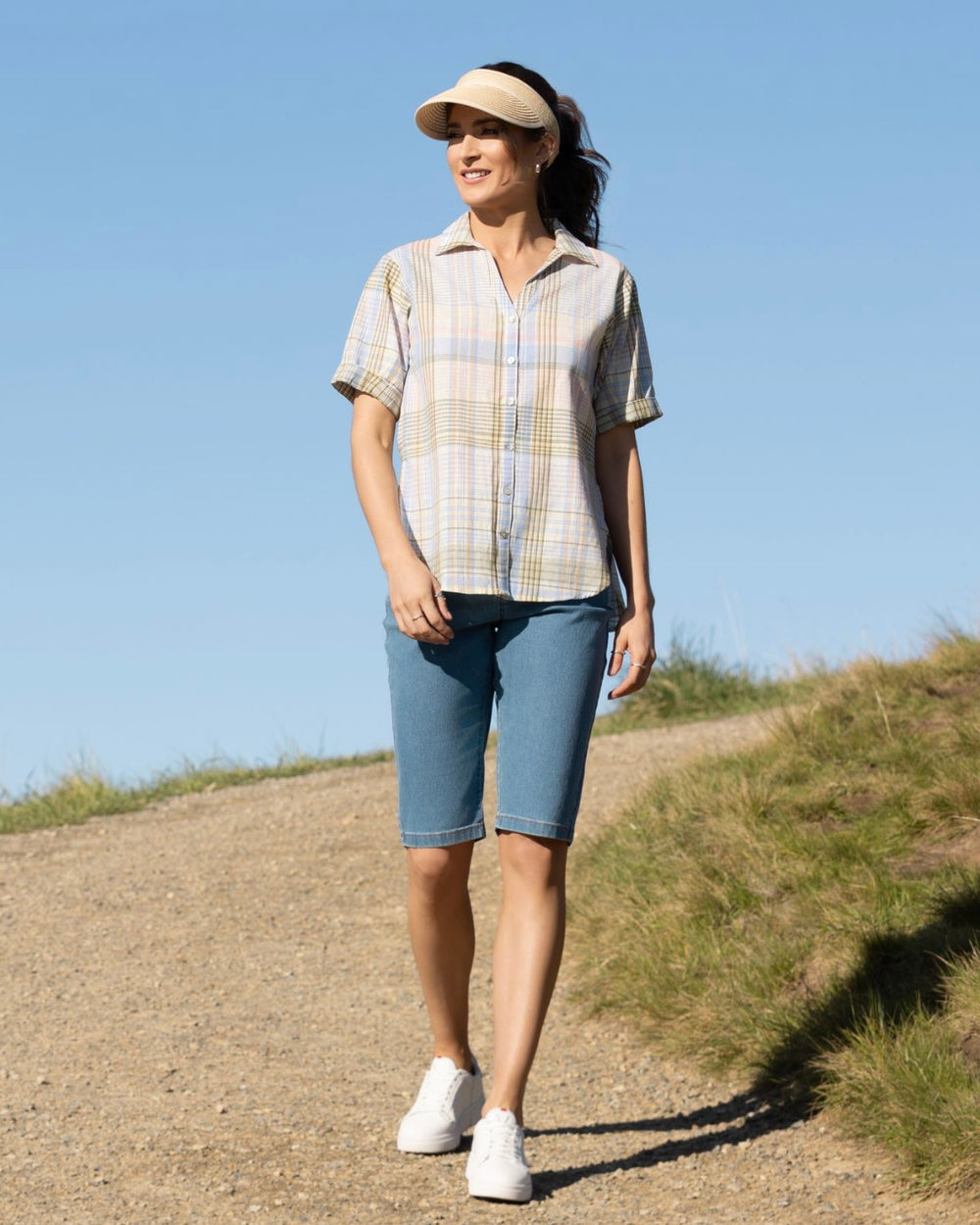 Dropped Shoulder Shirt with Rounded Hem - Blue Check