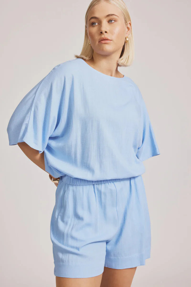 An easy everyday top in a textured linen-cotton blend. Features relaxed short sleeves and a round neckline. An elasticated hem allows for versatile styling, as it allows for easy tucking at multiple lengths.